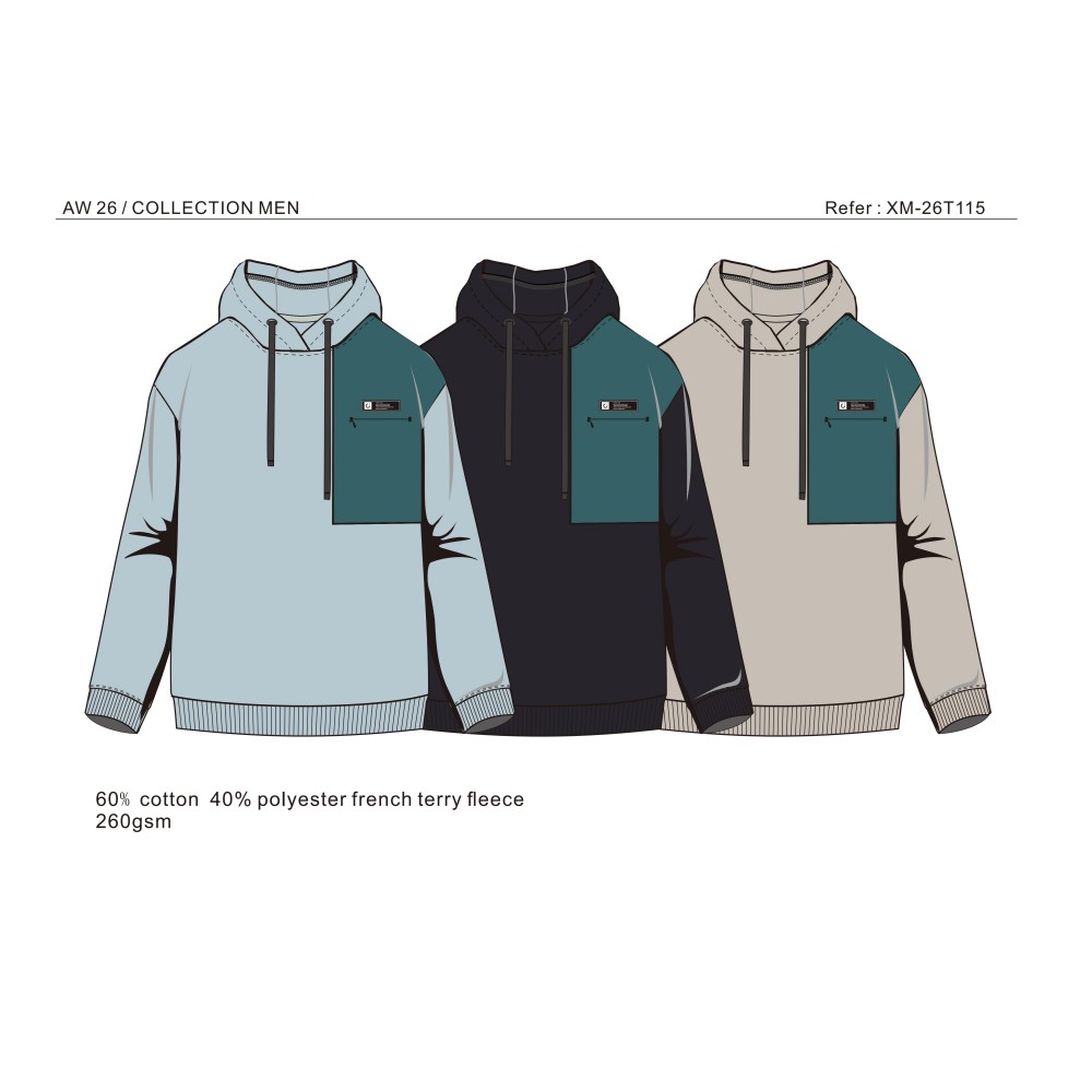 Fabric: French terry brushed 60%cotton 40%polyester 260gsm